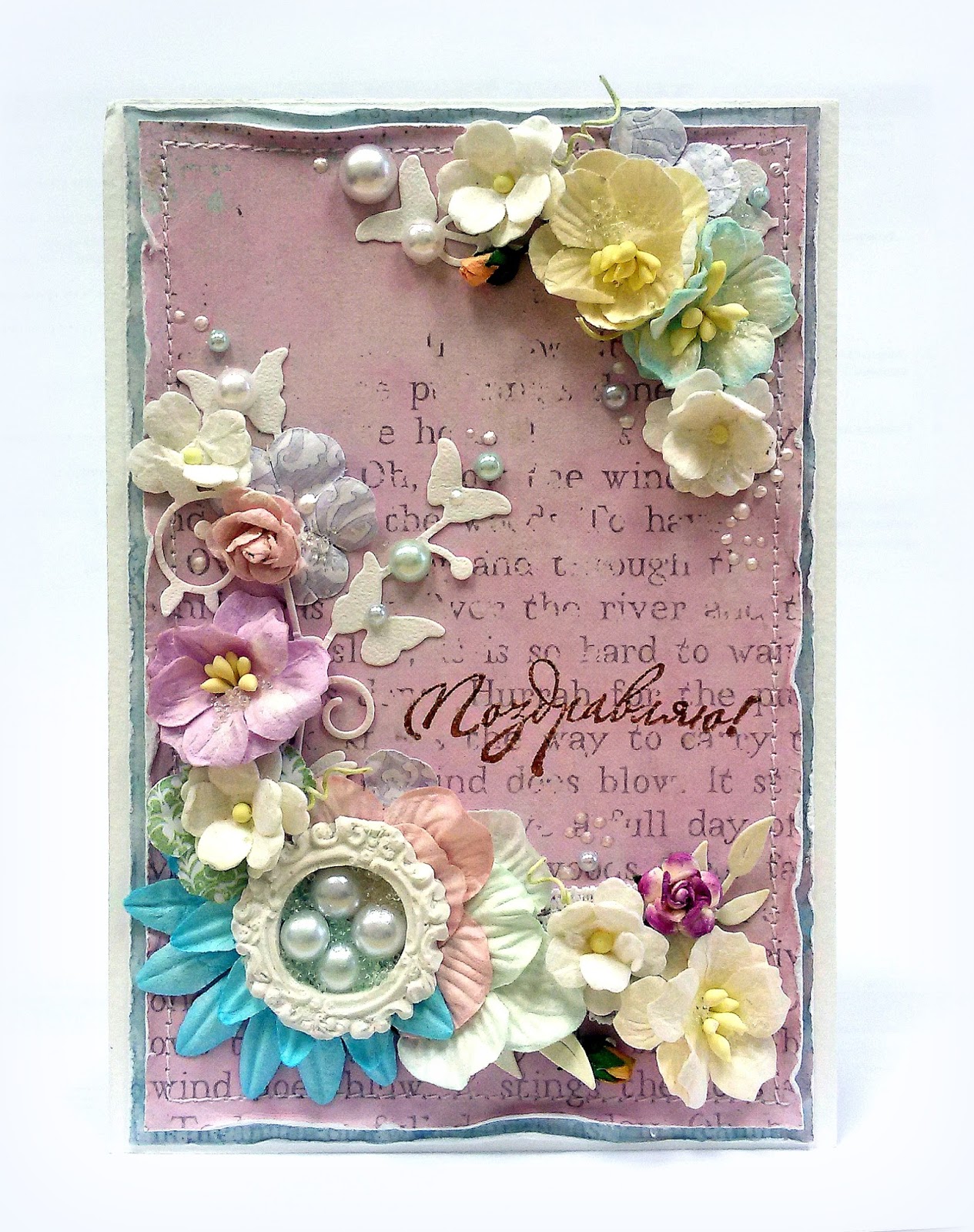 По скетчу сложила очень нежную, девичью открытку. В ней сплелись цветы, бусины, бабабочки... В основе бумага "Очарование" от тм Скрапбург