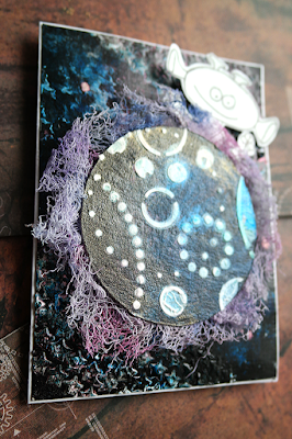 По заданию у меня сложилась космическая открыточка из прекрасной коллекции "Млечный путь" от Polkadot, а также в работе использовала кальку, дотсы и нитки.