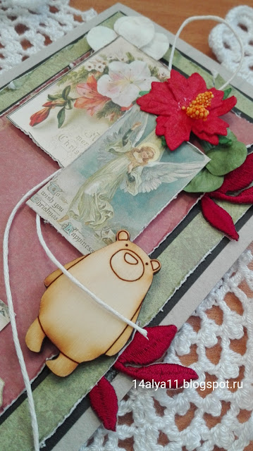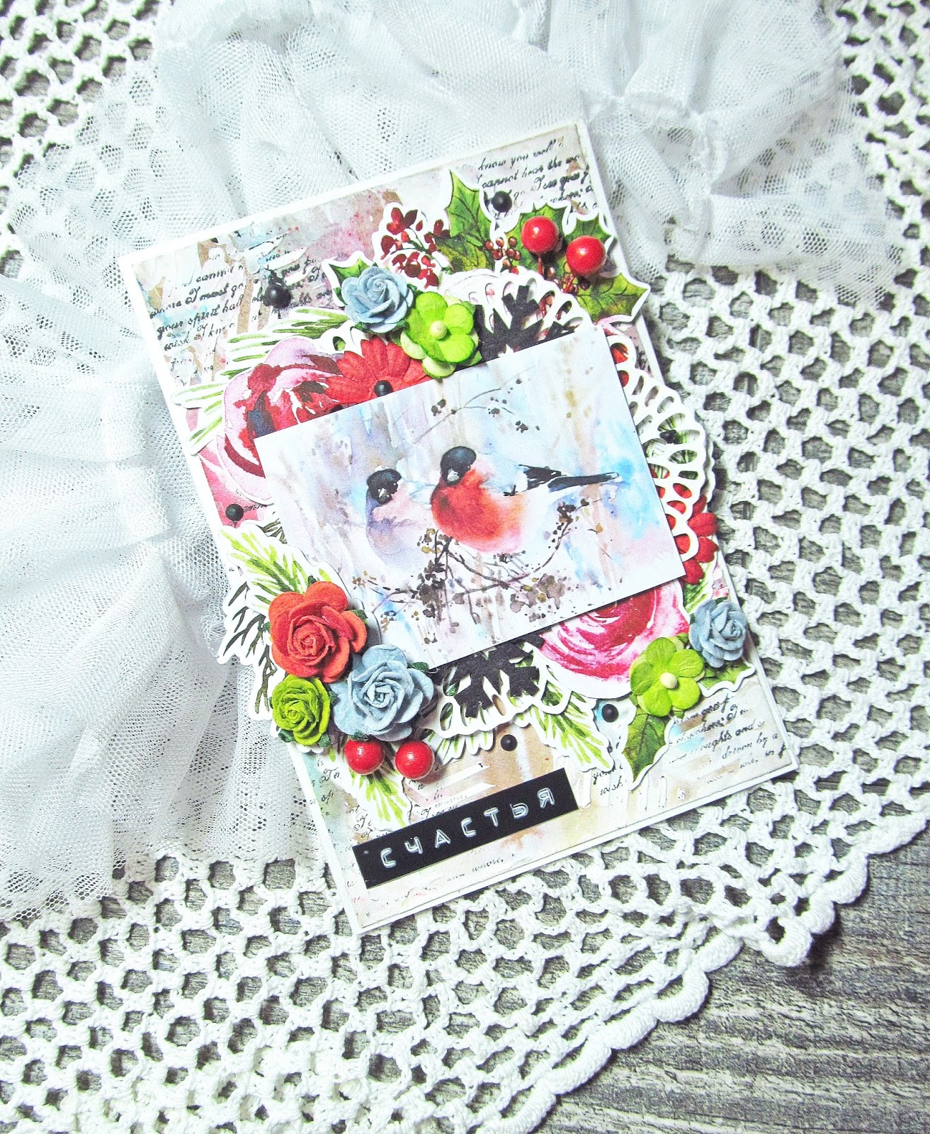 С этой открыткой произошла забавная история: мне было грустно и я хотела сделать винтажную работу, но в процессе в который раз убедилась, сто винтаж - это не моё, так что у снегиря появился веселый колпак, а открытка пополнилась яркими деталями)